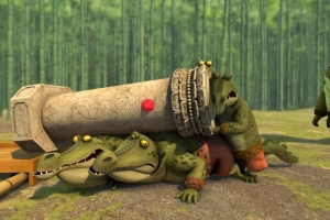 Po is tricked into saving the leader of the Croc Bandits’ brother when in fact he has kidnapped the son of a powerful landowner.